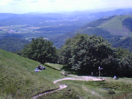Petit repos au Lepoeder (ou Collado Lepoeder), 1431m. Flèches rouges : à gauche l'abbatiale de Roncesvalles, à droite le Puerto de Ibañeta (1056m) ou Col de Roncevaux.
